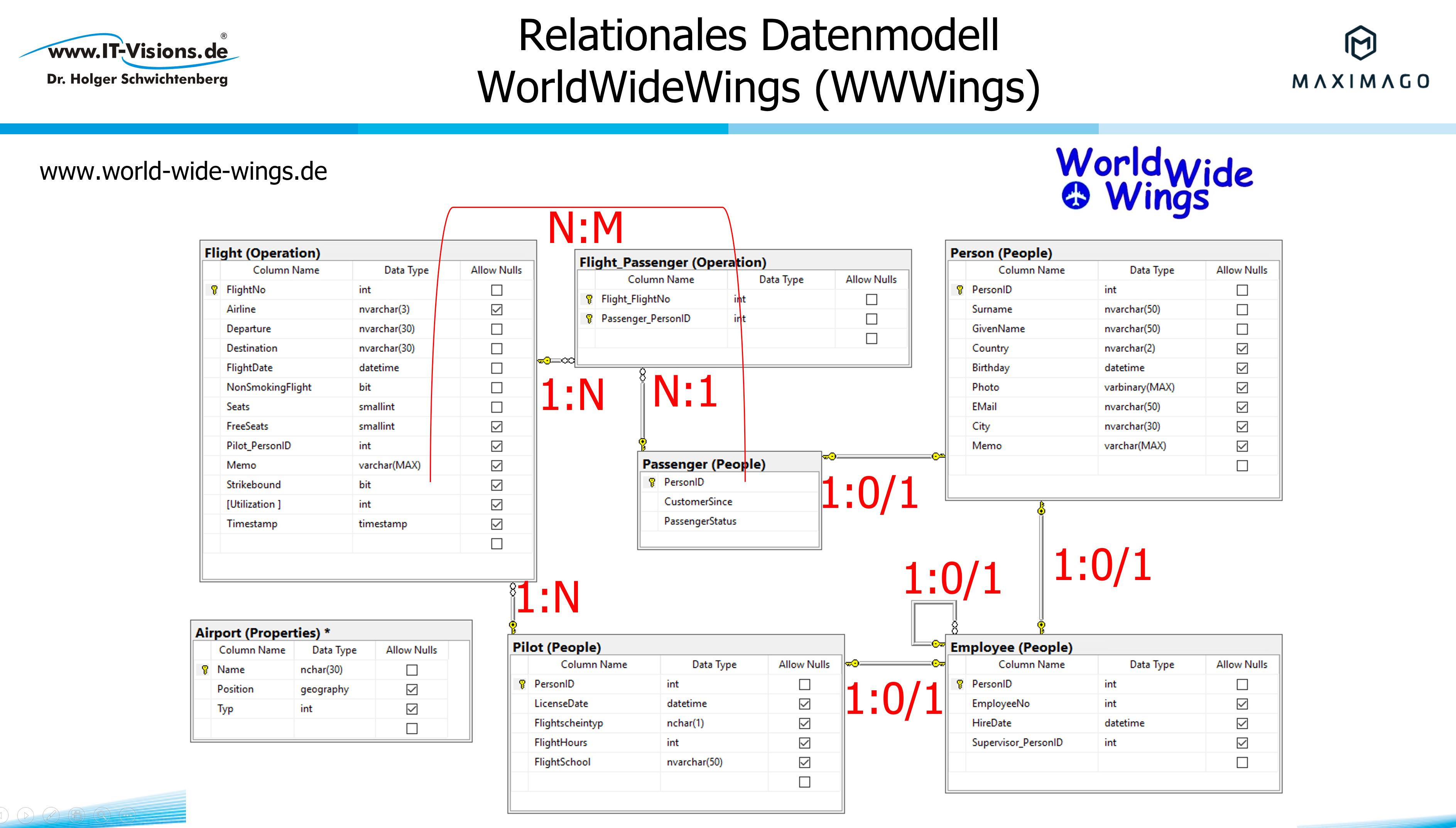 Die Datenbank von WorldWideWings wird in den unten beschriebenen .NET-Fallbeispielen mit modernem und klassischen .NET sowie in allen Ausgaben des Fachbuchs "Entity Framework Core".